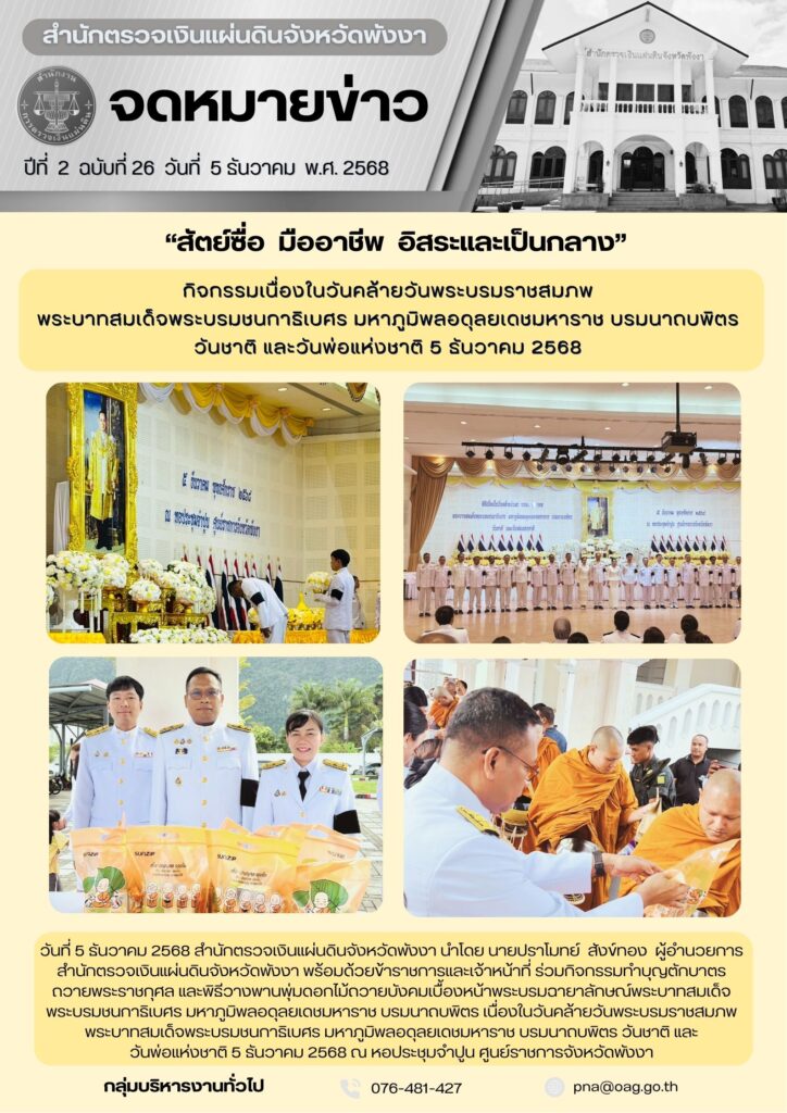 กิจกรรมเนื่องในวันคล้ายวันพระบรมราชสมภพ พระบาทสมเด็จพระบรมชนกาธิเบศร มหาภูมิพลอดุลยเดชมหาราช บรมนาถบพิตร วันชาติ และวันพ่อแห่งชาติ 5 ธันวาคม 2568ข่าวประชาสัมพันธ์, งานราชพิธี/รัฐพิธีธันวาคม 5, 2025ธันวาคม 12, 2025 Post Views: 112
