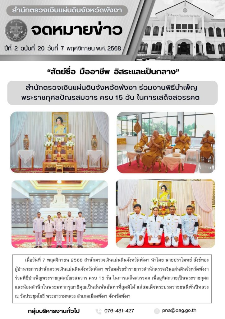 สตจ.พังงา ร่วมพิธีบำเพ็ญพระราชกุศลปัณรสมวาร ครบ 15 วัน ในการเสด็จสวรรคต เพื่ออุทิศถวายเป็นพระราชกุศลแด่สมเด็จพระบรมราชชนนีพันปีหลวง ข่าวประชาสัมพันธ์, งานราชพิธี/รัฐพิธีพฤศจิกายน 8, 2025พฤศจิกายน 8, 2025 Post Views: 85