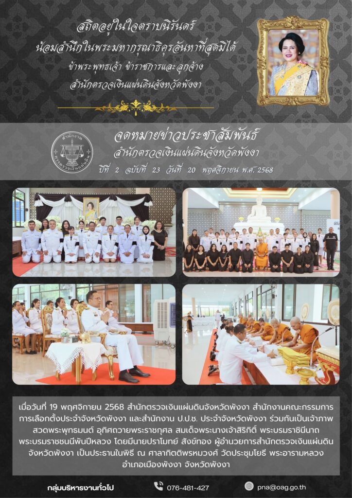 สำนักตรวจเงินแผ่นดินจังหวัดพังงา สำนักงานคณะกรรมการเลือกตั้งประจำจังหวัดพังงา และสำนักงาน ป.ป.ช.ประจำจังหวัดพังงา ร่วมกันเป็นเจ้าภาพสวดพระพุทธมนต์ อุทิศถวายพระราชกุศล สมเด็จพระนางเจ้าสิริกิติ์ พระบรมราชินีนาถ พระบรมราชชนนีพันปีหลวงUncategorized, ข่าวประชาสัมพันธ์, งานราชพิธี/รัฐพิธีพฤศจิกายน 20, 2025พฤศจิกายน 20, 2025 Post Views: 133