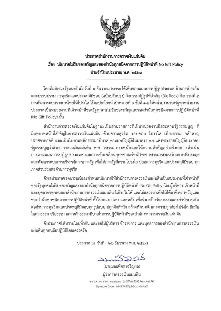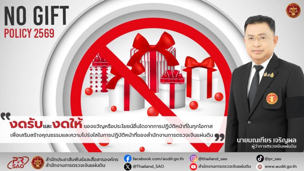 No Gift Policy 2569สตง. งดรับ และ งดให้ ของขวัญหรือประโยชน์อื่นใดจากการปฏิบัติหน้าที่ในทุกโอกาส เพื่อเสริมสร้างคุณธรรมและความโปร่งใสในการปฏิบัติหน้าที่ของสำนักงานการตรวจเงินแผ่นดินข่าวประชาสัมพันธ์, บทความ/เอกสารเผยแพร่, อินโฟกราฟิกธันวาคม 29, 2025ธันวาคม 29, 2025 Post Views: 110